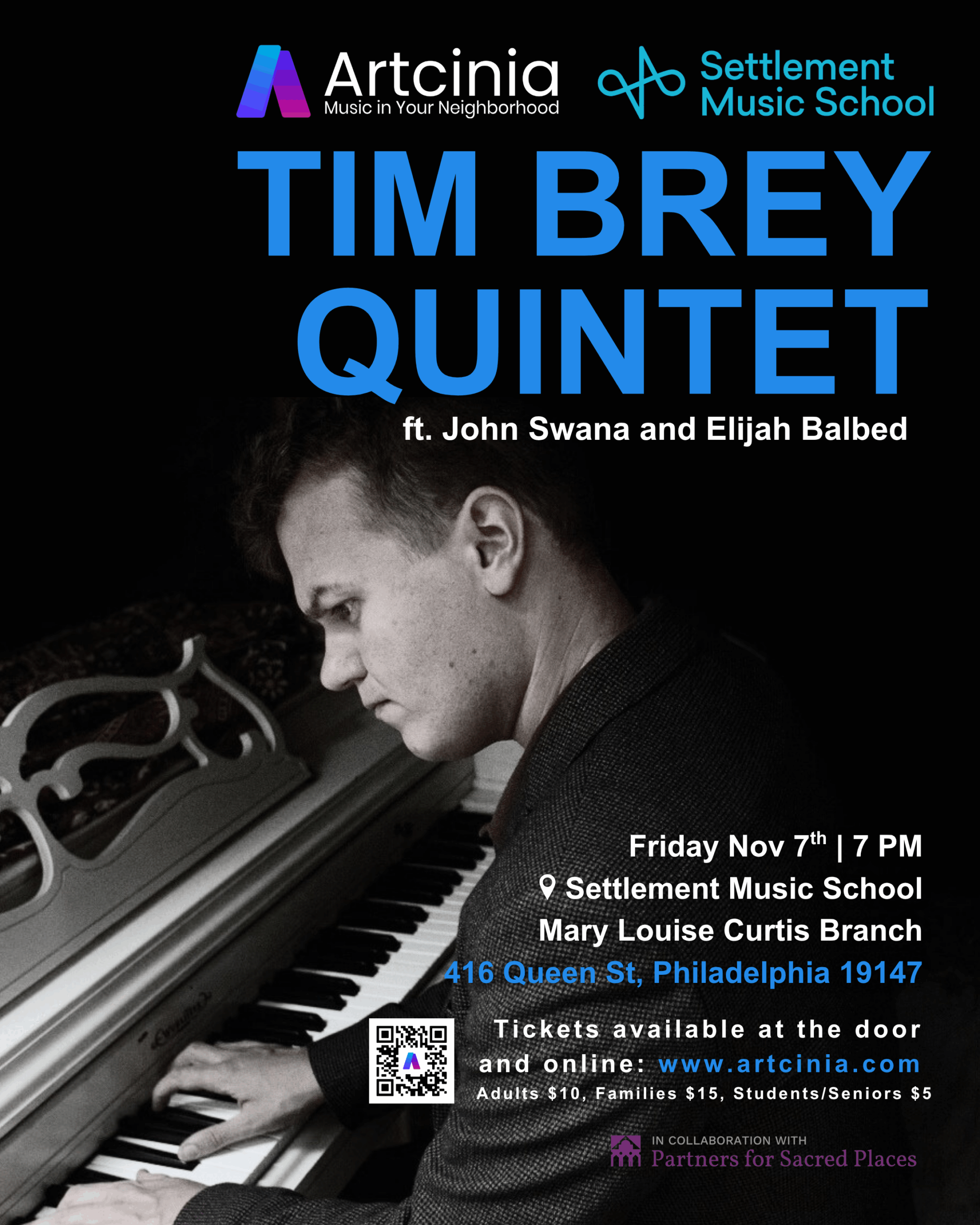 Celebrate Artcinia's collaboration with Settlement Music School and join us for an evening with the Tim Brey Quintet, ft. John Swana and Elijah Balbed. Tickets: Adults $10, Families $15, Students/Seniors $5.