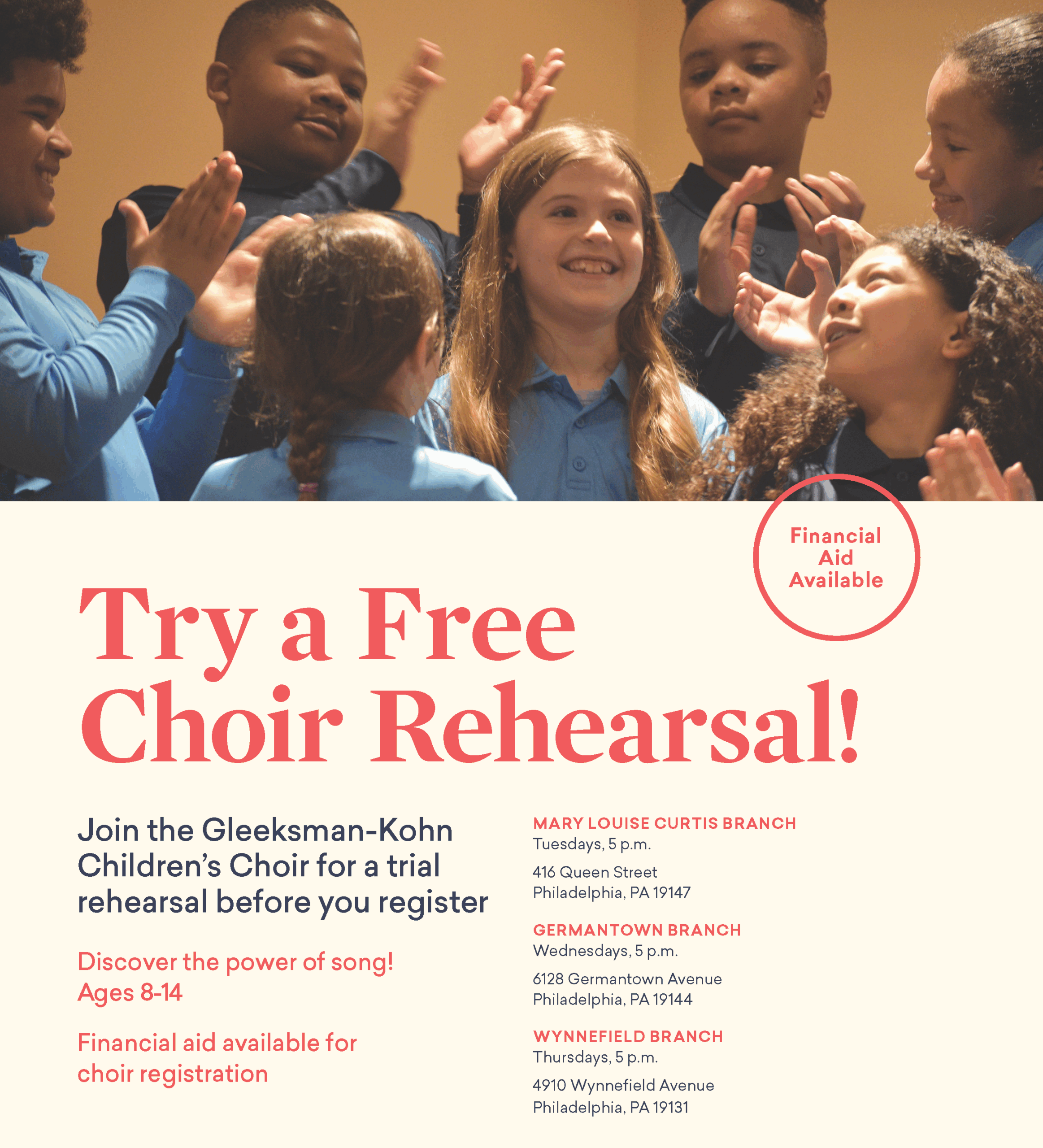 To learn more about the Gleeksman-Kohn Children’s Choir and your free rehearsal, contact Children’s Choir Director Suzanne Sweeney, suzanne.sweeney@settlementmusic.org