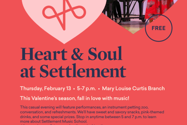 Mary Louise Curtis Branch 416 Queen St., Philadelphia, PA, United StatesStop in anytime between 5 and 7 p.m. to learn more about Settlement Music School. This casual evening will feature performances, an instrument petting zoo, conversation, and refreshments. We’ll have sweet and savory snacks, pink-themed drinks, and some special prizes. All are welcome. Bring your family, and a friend!