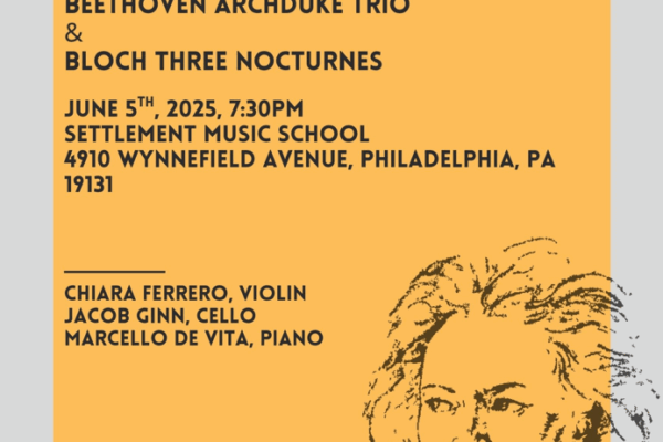 Come see a concert with Trio New World, featuring Settlement Music School faculty members Chiara Ferrero (violin), Jacob Ginn (cello), and Marcello De Vita (Piano). This event is free and open to the public.